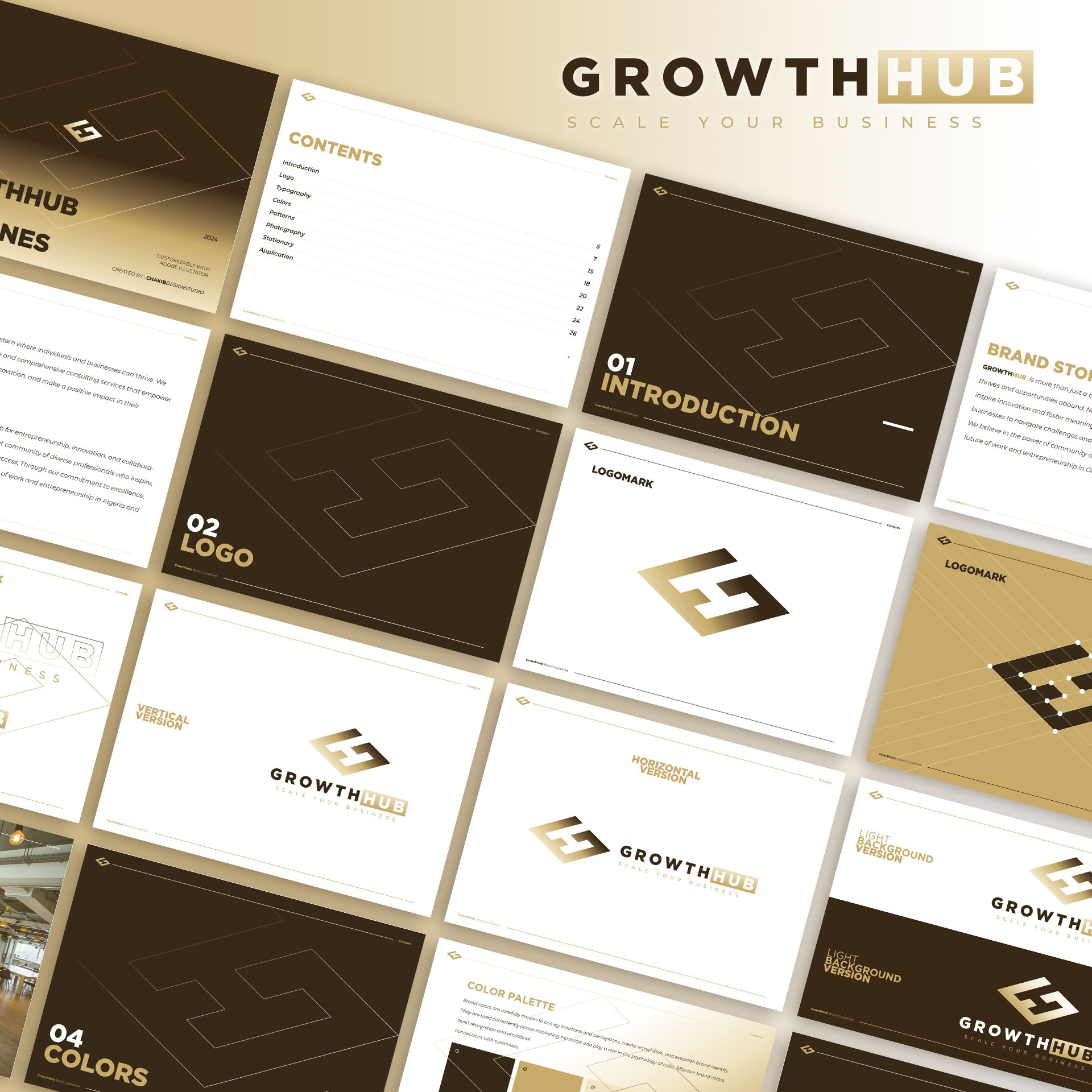 فضاء عمل مشترك في مدينة وهران، موجّه لرواد الأعمال، المستقلين، والفرق الناشئة. اعتمد المشروع على تصميم شعار مونوجرام يجمع بين حرفي G و H ليعكس مفاهيم النمو، الترابط، وبناء المنظومة المهنية. جاءت الهوية البصرية عصرية وواضحة، مع نظام متكامل يضمن الاتساق عبر مختلف نقاط التواصل. تم تطوير المشروع كهوية شاملة مدعّمة بدليل استخدام العلامة (Brand Guidelines Book) لضمان تطبيق بصري احترافي وقابل للتوسع